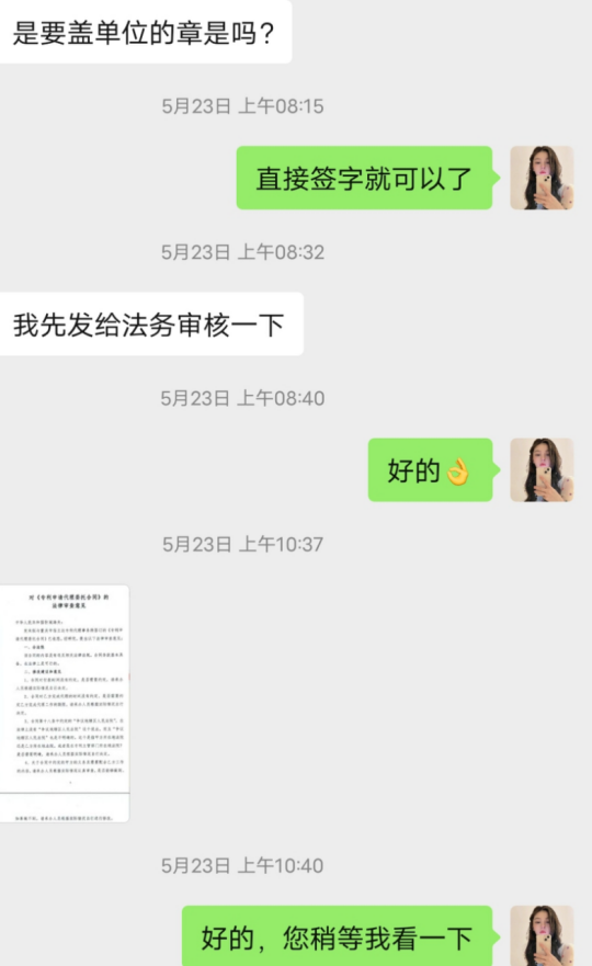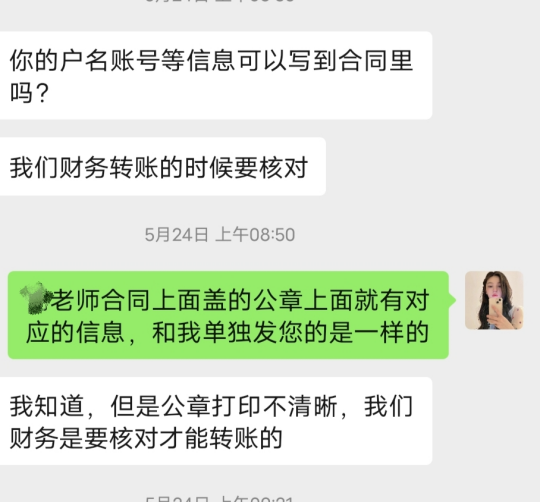 19號一早客戶確定了相關項目,客戶也很爽快。然后就有一些疑問:是否會保密,價格等相關問題,給客戶一一解決疑慮之后客戶基本了解了,也構建了初步的信任,只是合同擬定過去之后,需要他們單位法務審核,單位審核說需要簡單修改,法務那邊過不了,財務審核不過不讓打款,于是就在雙方法務都認可的情況下小小的改動了一下。發(fā)過去之后又有一個新問題:公章不清晰,公章信息這些看不清楚等,需要我們把公戶信息加在合同里面。