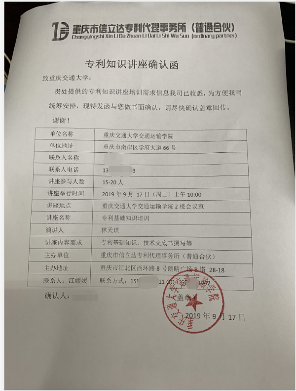 2019年9月17日重慶信立達在《重慶交通大學交通運輸學院》 順利召開專利講座